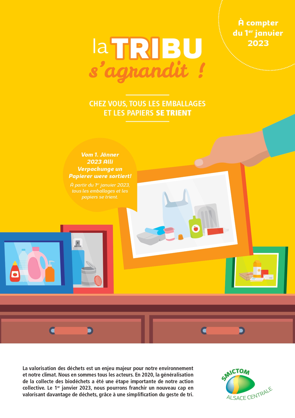 A compter du 1er janvier 2023, vous pourrez déposer tous vos emballages et papiers imprimés dans le bac jaune.