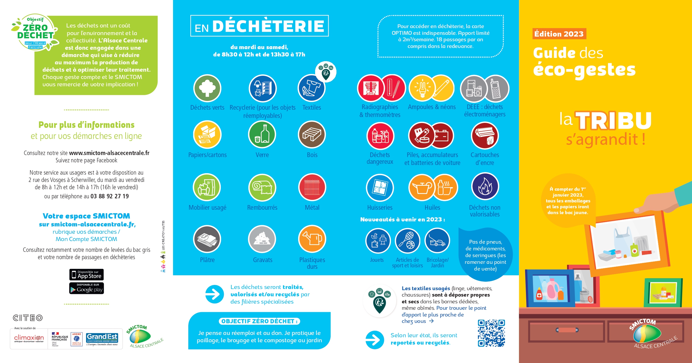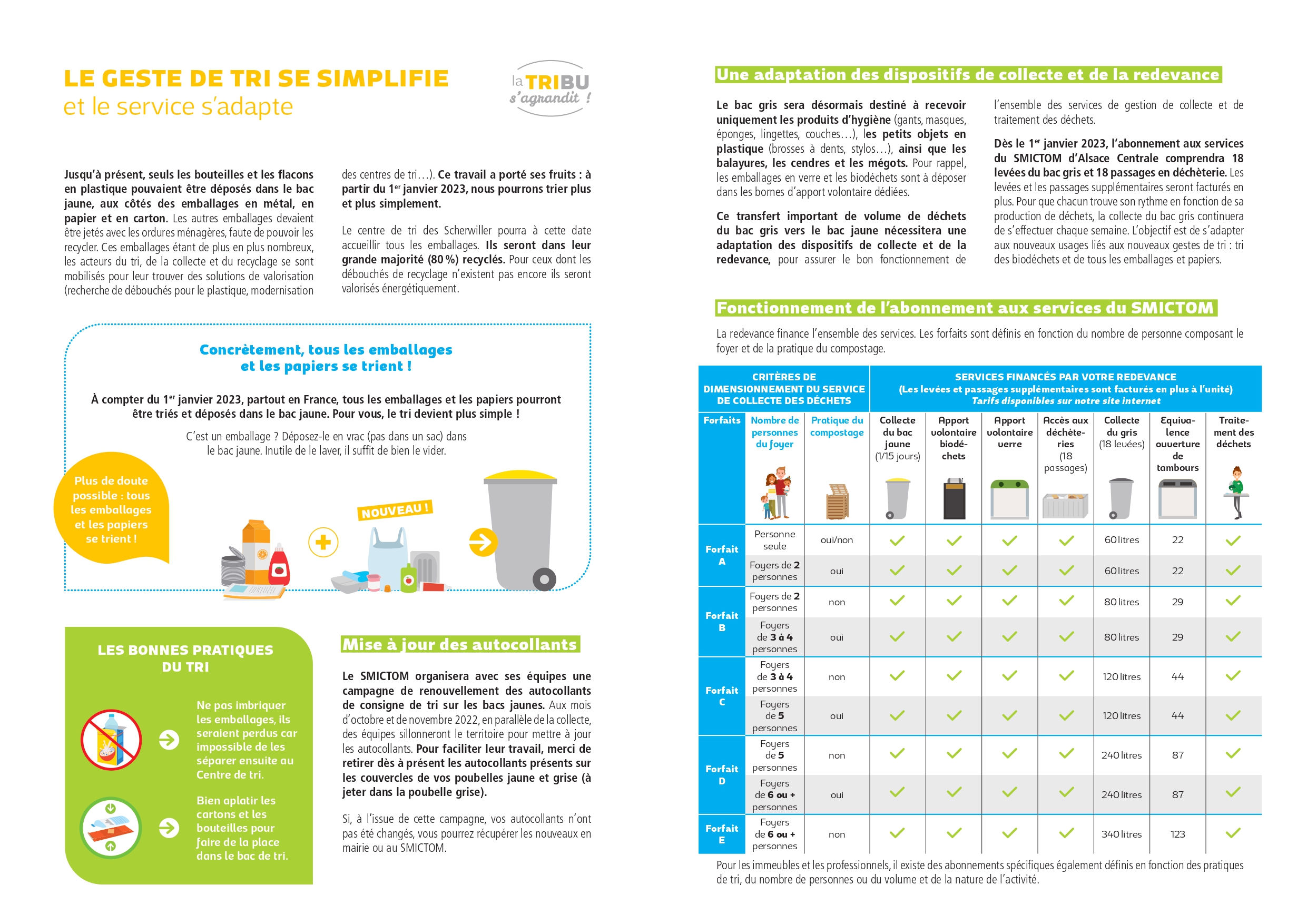 Dès le 1er janvier 2023, l’abonnement aux services du SMICTOM d’Alsace Centrale comprendra 18 levées du bac gris et 18 passages en déchèterie. Les levées et les passages supplémentaires seront facturés en plus. Pour que chacun trouve son rythme en fonction de sa production de déchets, la collecte du bac gris continuera de s’effectuer chaque semaine. L’objectif est de s’adapter aux nouveaux usages liés aux nouveaux gestes de tri : des biodéchets et de tous les emballages et papiers. Retrouvez toutes les informations sur le site www.smictom-alsacecentrale.fr