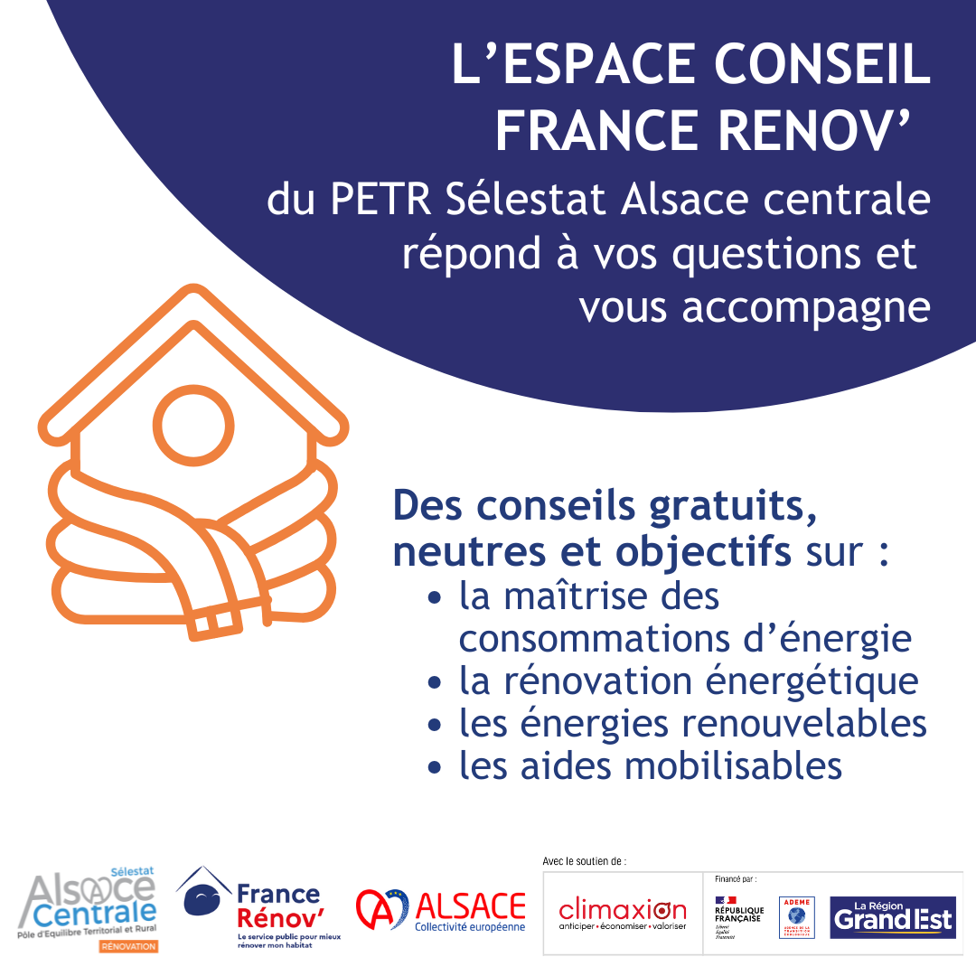 L’Espace Conseil France Rénov’ du PETR Sélestat Alsace Centrale est un service public neutre et gratuit qui vous aide à y voir clair dans votre projet de rénovation :