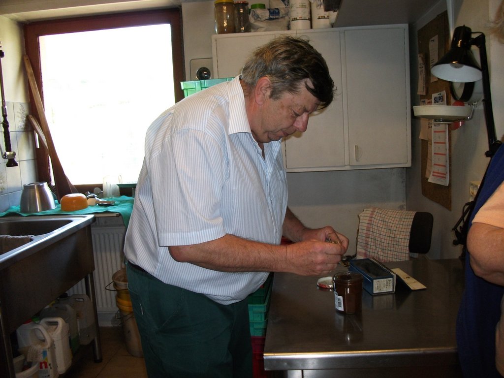 Avec 100kg de fruits, notre artisan obtient une moyenne de 350 pots. Certains fruits, comme l’églantine, le cassis, les mûres les framboises passent à la centrifugeuse pour être mixés après cuisson. Ce sont ainsi une quarantaine de confitures et gelées que Fernand a élaborées au fil des années; fruits courants bien sûr, mais aussi variétés plus recherchées: coing à l’orangeade et aux abricots secs, griottes au miel et au kirsch, Lune de miel… Mais au vu de la quantité de jus rendue par la cuisson des fruits et qu’il fallait jeter, a émergé l’idée de l’utiliser pour en faire sirops, sorbets et crèmes glacées. Aujourd’hui, Fernand fabrique une quinzaine de glaces (rhubarbe au yaourt, coing-mirabelle, myrtille…), des pâtes de fruits, huit sirops et plus marginalement , de la sauce tomate. Afin d’éviter tout risque de contamination, ses glaces ne contiennent jamais d’oeufs! Car les microbes »esquimaux », résistants au froid et qui pourraient s’y trouver, se réveillent à la chaleur (pour l’anecdote, il existe aussi les microbes dits « africains »)! Depuis plusieurs années, il s’est lancé dans l’élaboration de desserts glacés. Les visiteurs d’un jour ont d’ailleurs été invités à une dégustation de vacherin fabrication maison!